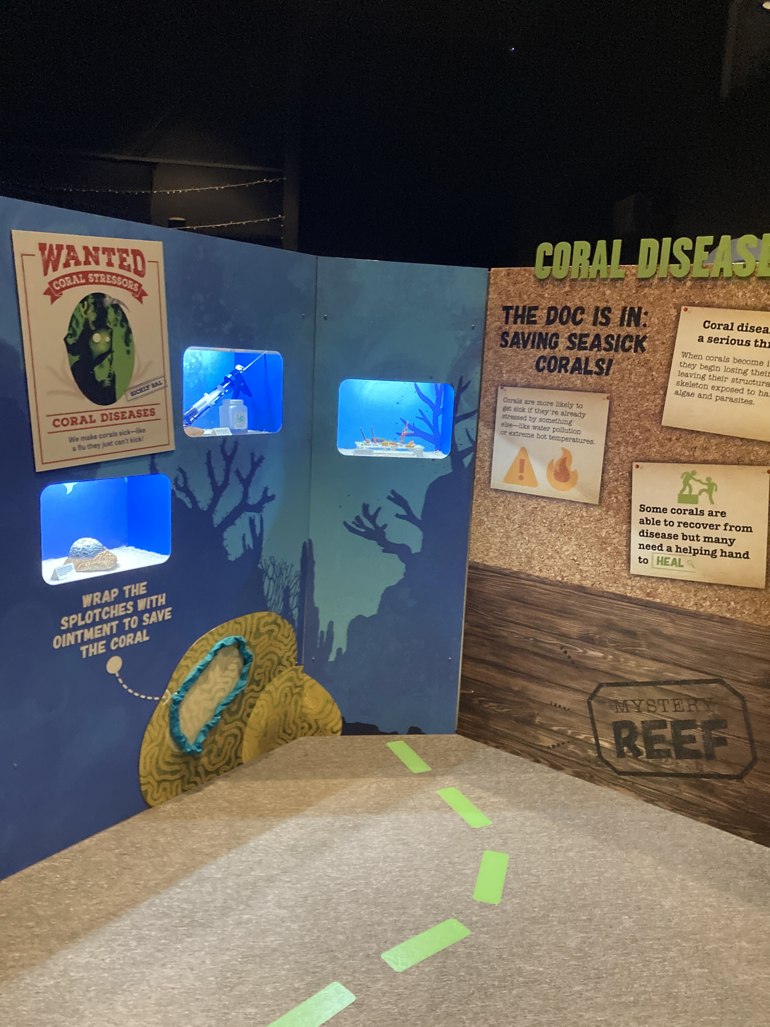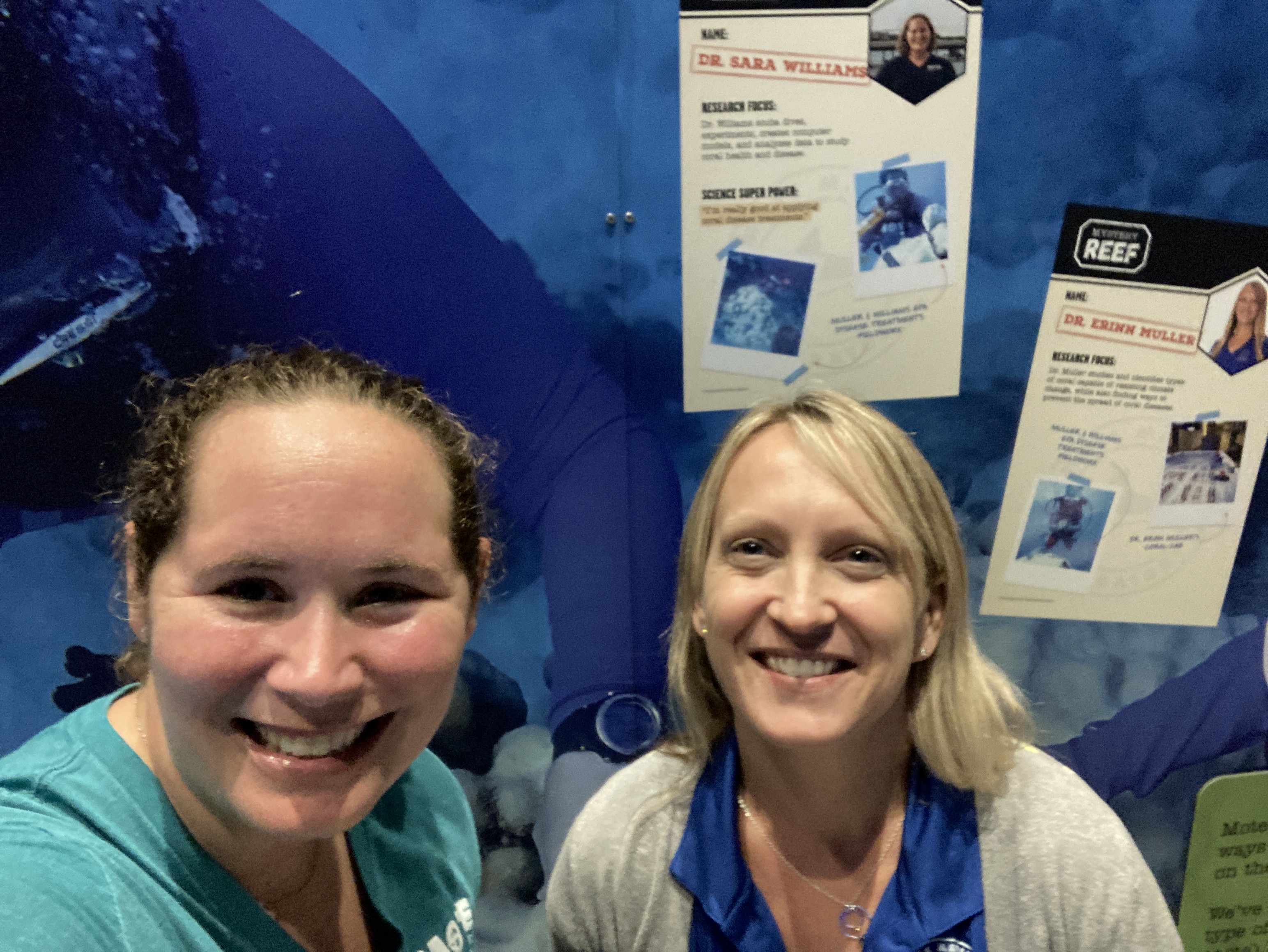 While at Mote, I lead tours of our lab spaces to perspective donors and various education groups. I’ve presented about my research at monthly Volunteer meetings, several brown bag research seminars, and public lectures (e.g. Mote-ivational Monday 2025 Lecture). Additionally, I have served as a science officer for the Sarasota Chapter of SCUBAnauts, a position in which I led monthly marine science lessons and occasional dives for this group of passionate ocean-minded high schoolers. In 2022, I accompanied Dr. Erinn Muller to to Saba Sea and Learn, where we taught several different local groups about coral reefs and led several dives surveying stony coral tissue loss disease around the island (learn more here). Working at Mote also provides opportunities to directly interact with and share my research with aquarium visitors. In 2024, I consulted with the Aquarium’s exhibits team on their Mystery Reef Exhibit that featured research by Mote’s Coral Scientists.